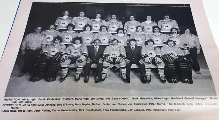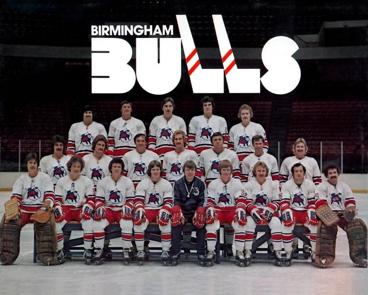 1976 год. Бирмингем (Алабама). «Бирмингем Буллс». Вацлав Недомански (третий справа в среднем ряду) и Рихард Фарда (второй слева в верхнем ряду) на командном снимке перед сезоном 1976/77 годов, который «быки», уехавшие из Торонто, провели в «Сердце Юга» - штате Алабама (icehockey.fandom.com)