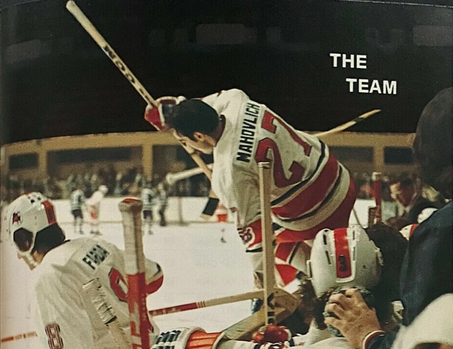 Сезон 1974/75 годов. Нападающие «Торонто Торос» Рихард Фарда (№ 8) и Фрэнк Маховлич выходят на площадку (Toronto Toros Action Guide 1975-76)