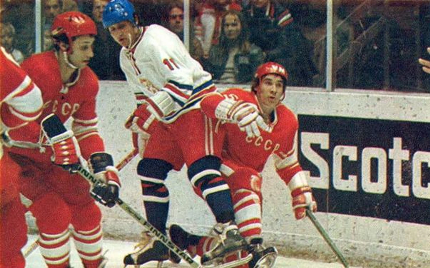 18 апреля 1974 года. Хельсинки. «Яхалли». Чемпионат мира и Европы. СССР - ЧССР - 3:1. Рихард Фарда в окружении советских хоккеистов