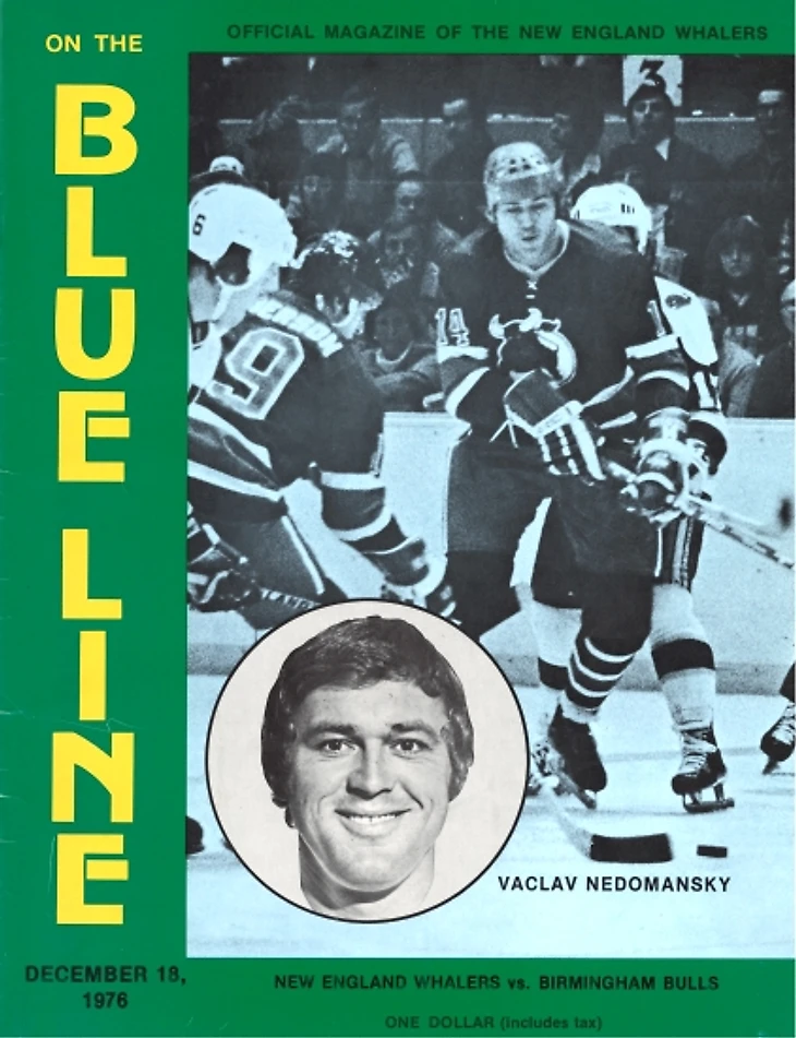Вацлав Недомански на обложке буклета, выпущенного к матчу «Бирмингем Буллс» - «Нью-Ингленд Уэйлерс» (2:6), состоявшемуся 18 декабря 1976 года в «Бирмингем-Джефферсон конференц-комплекс» (birminghamprosports.com)
