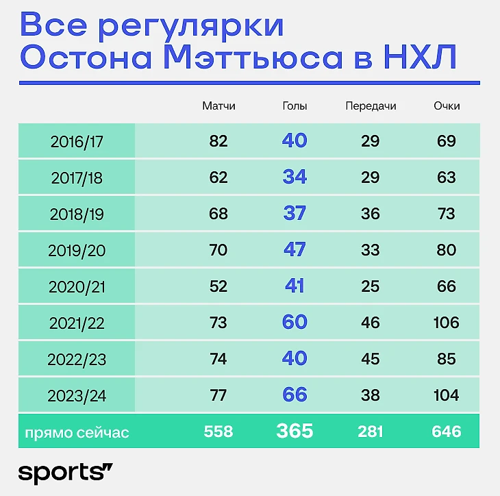 Пока Мэттьюс далековат от исторических забот Овечкина, но он и младше на 12 лет. А голов уже прилично – 365 за почти 8 регулярок.