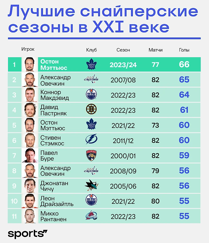 Последним, кто наколотил столько шайб до Овечкина, был Марио Лемье в сезоне-1995/96, когда забросил 69 голов за «Питтсбург». Но вообще в масштабах всей истории этот сезон Мэттьюса только 22-й. Первая десятка открывается 71 голом Уэйна Гретцки (1982/83) и заканчивается 92 голами Уэйна Гретцки (1981/92).