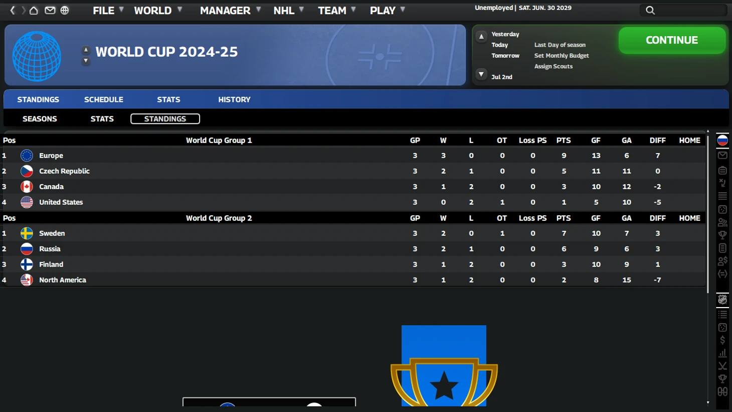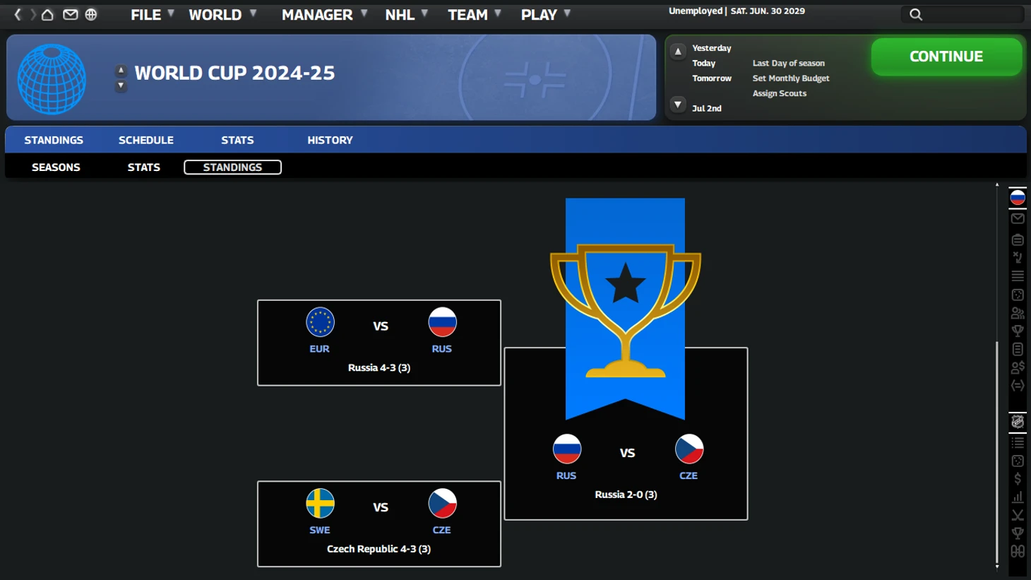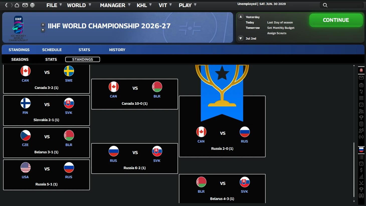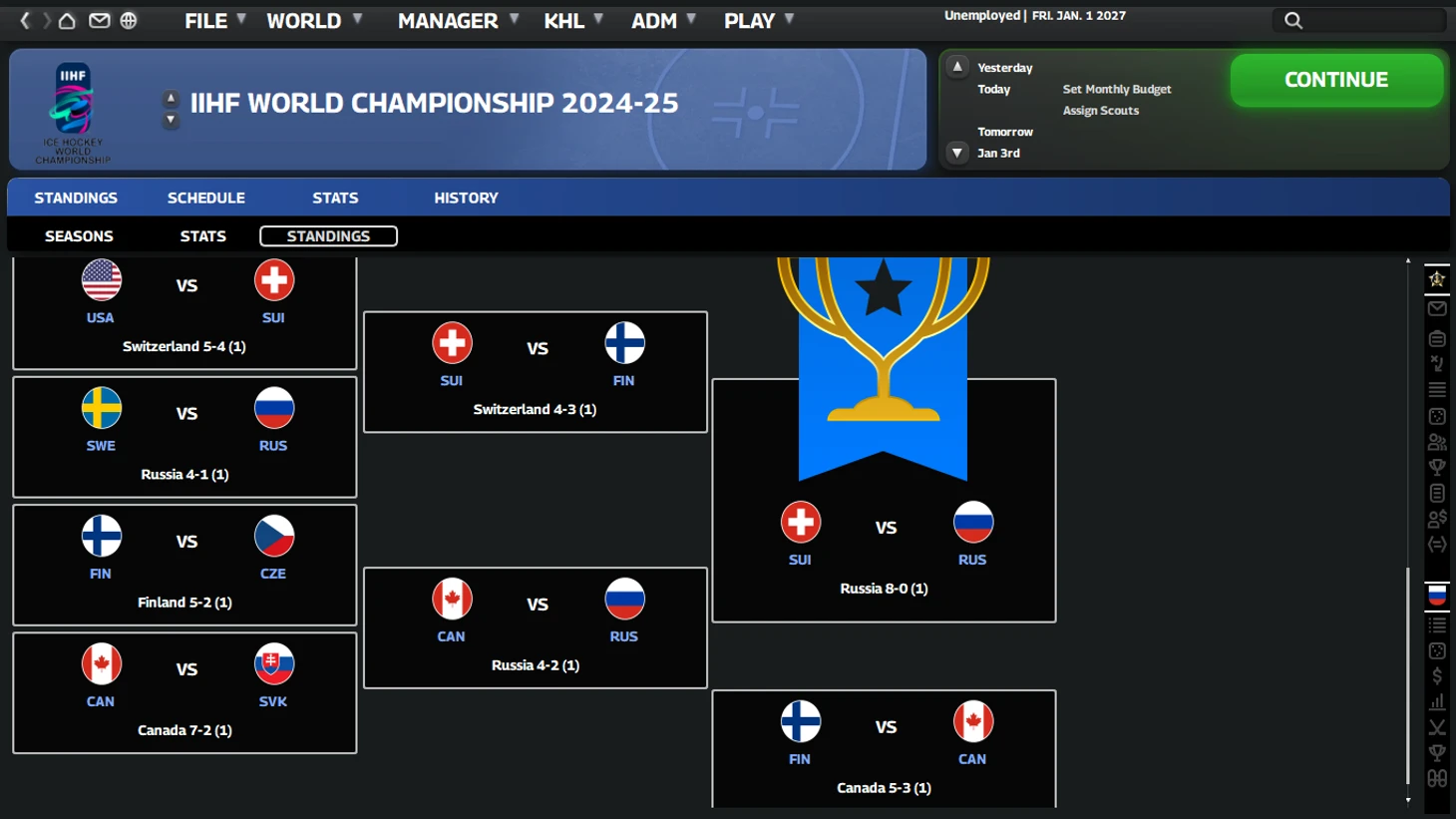 Что касается выступлений сборных в этот период, то олимпийский хоккейный турнир 2026 года прошел без участия России. Однако, в реальности FHM, НХЛ регулярно проводит Кубок мира. В этот раз он состоялся в 2024 году, и Россия уже присутствовала на нем, и она стала победителем! Тот турнир был интересен тем, что Канада и США не вышли из группы, а в финале встретились Россия и Чехия.