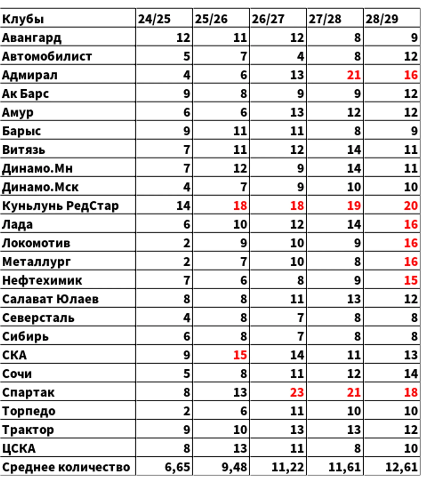 Исходя из таблицы ниже, заметно, что с сезона 2025/2026 в лигу начало приезжать множество иностранцев, конкуренция за место в составе в командах однозначно возросла значительно. Теперь наличие нужного гражданства — не гарантия хорошего контракта, вместо паспортиста можно взять недорогого легионера. Очевидно, что «Куньлунь» формировался все эти сезоны множеством легионеров, т. к. китайцев, которые смогут играть на уровне КХЛ, попросту нет. Также множество иностранцев появились в «Адмирале», «Спартаке». В сезоне 2028/2029 практически у всех клубов легионеров в составе было не менее 10. Тем не менее это не означало, что Кубок достанется таким командам, Россияне продолжали быть лучшими бомбардирами и важными игроками в клубах.