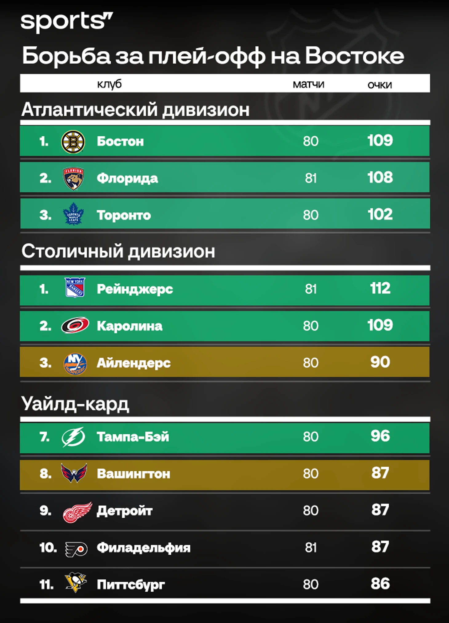 Продвижение «Вашингтона» не случилось бы без понижения «Питтсбурга». Команда Кросби и Малкина уступила «Бостону» (4:6) и опустилась ниже «Филадельфии». Но пространства для маневра у «Пингвинс» больше – благодаря одной игре в запасе перед «Флайерс». При этом 82-й матч регулярки «Питтсбург» сыграет с «Айлендерс».