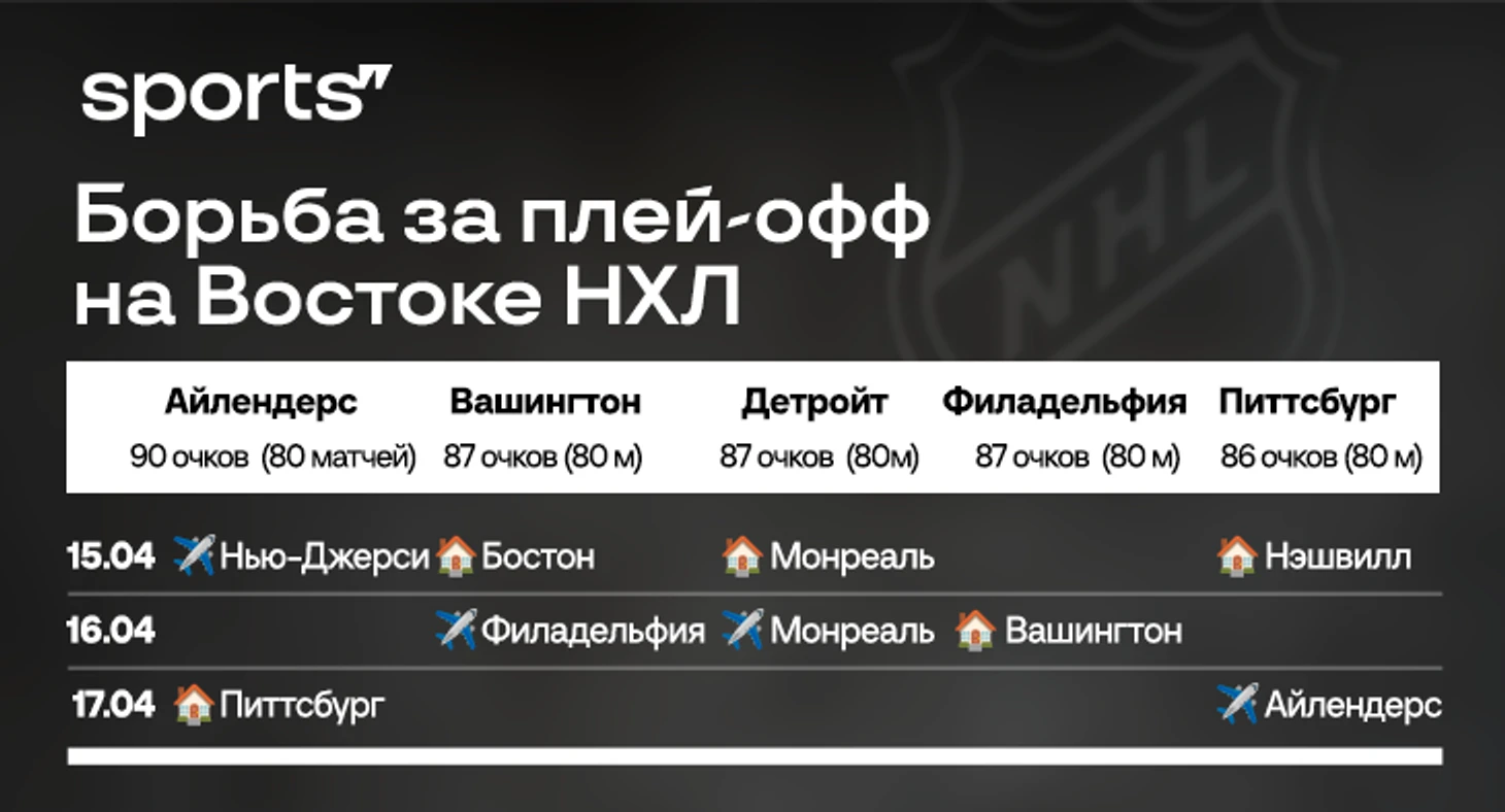 С другой стороны, «Детройт» может занять только последнее место в зоне уайлд-кард – позиции «Айлендерс» в Столичном дивизионе они никак не поколеблет. В то же время «Питтсбург» и «Вашингтон» претендуют и на третье место в дивизионе, и на последний уайлд-кард.