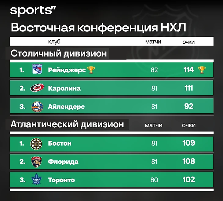Даже «Айлендерс» решили больше не вносить интригу в гонку за плей-офф – обыграли «Нью-Джерси» (4:1) и официально оформили себе выход в плей-офф. Итоговые топ-3 в дивизионах Востока выглядят так – других клубов здесь уже не будет, и только «Бостон» с «Флоридой» могут махнуться местами.