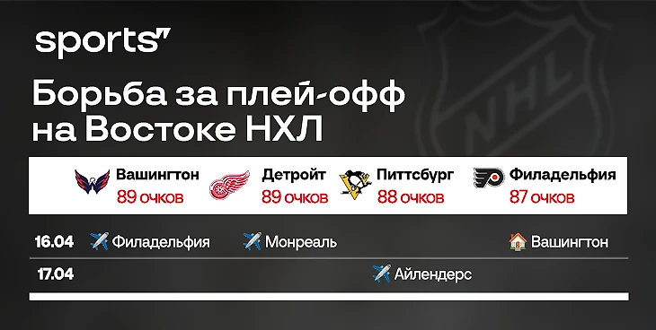 Ключевой момент – 16 апреля (ночь с 16-го на 17-е по московскому времени): там сыграют сразу два матча – «Филадельфия» – «Вашингтон» (02:00 мск) и «Монреаль» – «Детройт» (02:00 мск).