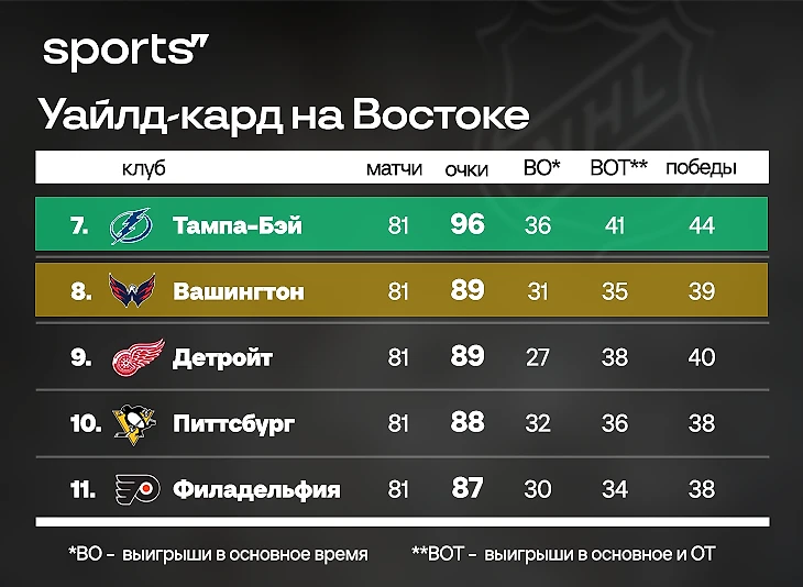 ● выиграет следующий матч – с «Айлендерс», а «Вашингтон» и «Детройт» проиграют свои матчи (в любом формате);