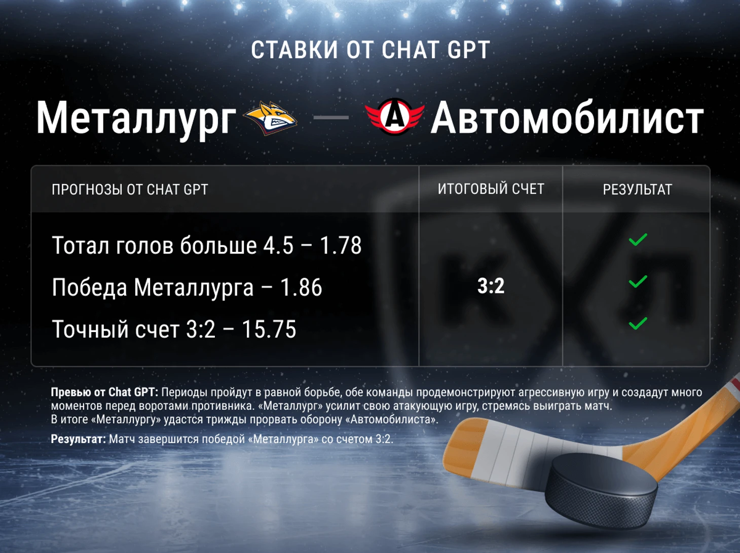 Chat GPT угадал счет 7-го матча «Магнитка» – «Автомобилист»