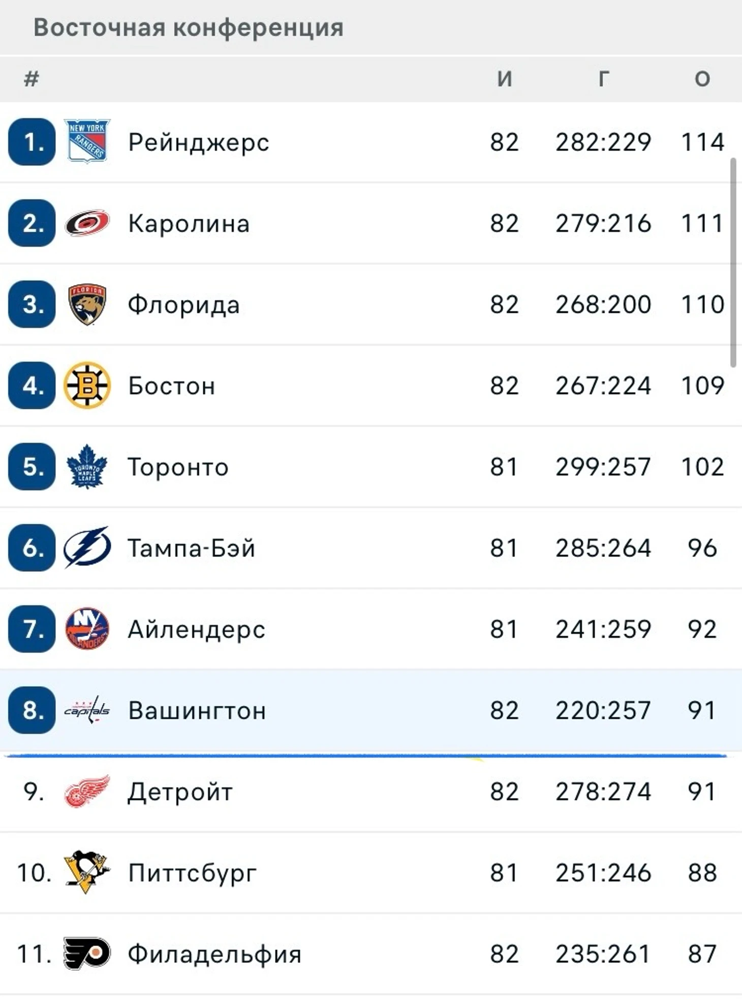 «Вашингтон» и «Детройт» набрали одинаковое количество очков (91), но «Кэпс» выше по дополнительным показателям.