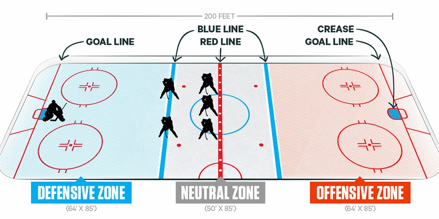 Давайте поразмышляем над одной из самых важных составляющих команд в плей-офф – игре в обороне, а именно покрытию защитной зоны (D-zone далее). Cхематично это всё что ниже синей линии для обороняющейся команды.