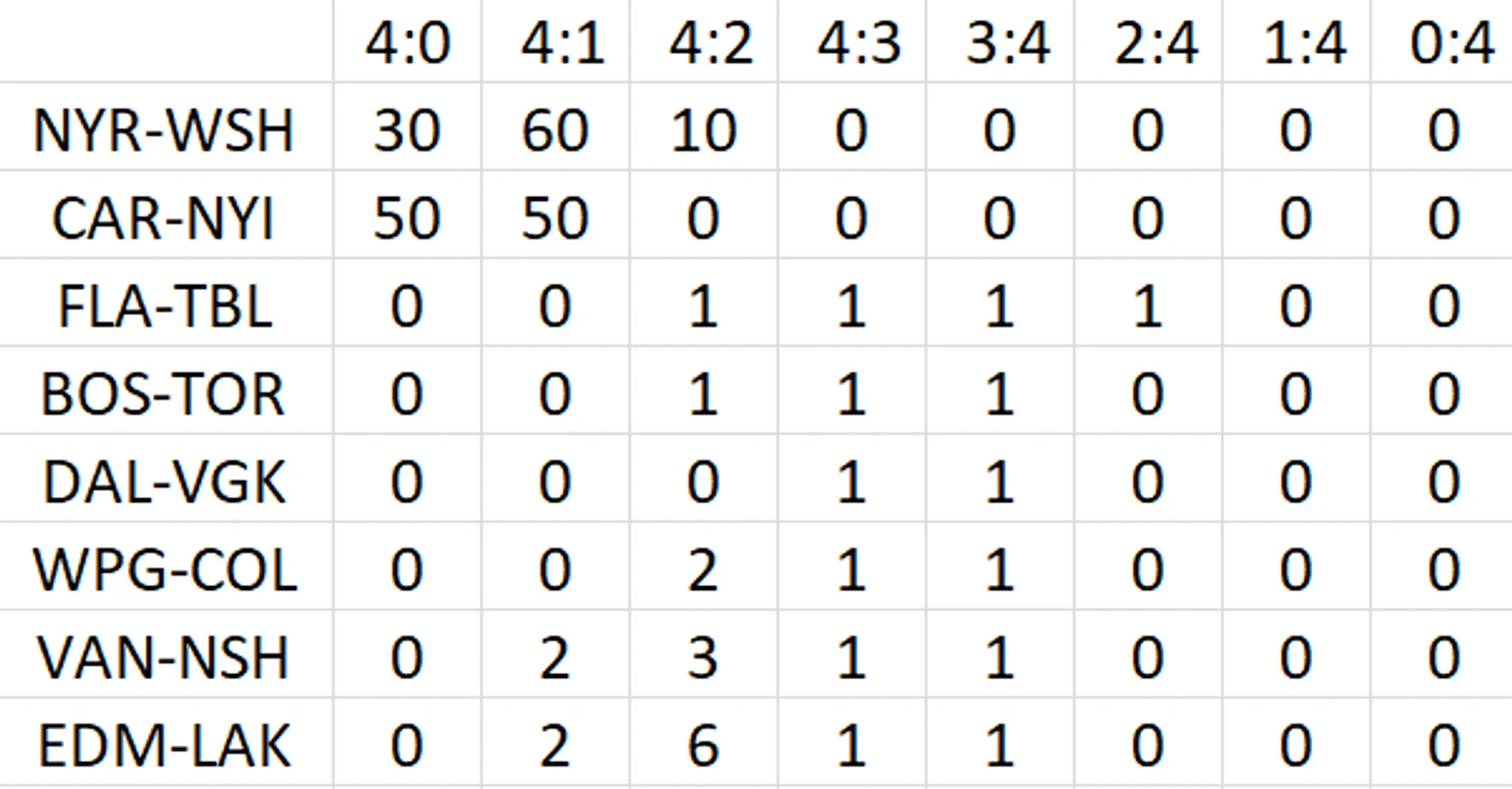 Я подумал, что несправедливо указывать конкретный счёт в серии, если веришь в два исхода 50 на 50 (допустим сейчас в Каролину 4:0 и 4:1). Решил предложить вам сделать прогнозы максимально точным образом — на каждый возможный исход (серия может закончиться 4:0, 4:1, 4:2, 4:3, 3:4, 2:4, 1:4, 0:4). От вас требуется лишь раскидать «шансы» на каждый исход. Первые числа на победу хозяев, последние на победу гостей. 4:0, 4:1, 4:2, 4:3, 3:4, ..., 0:4.