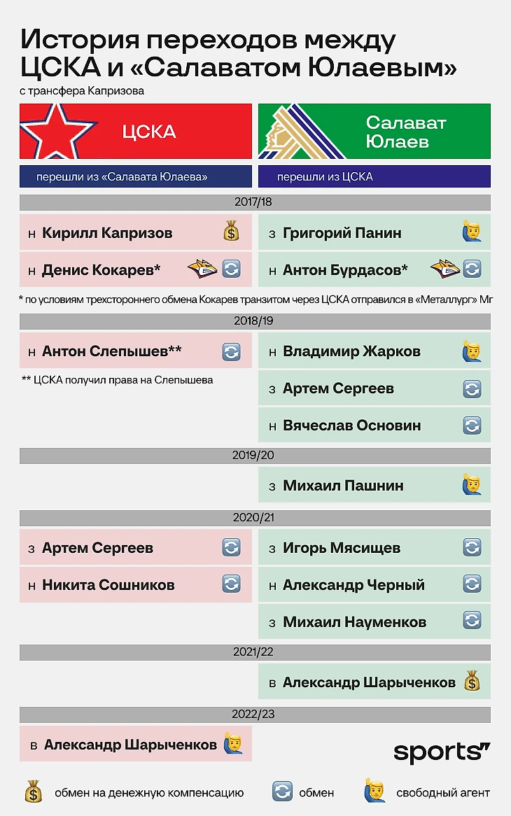С того момента произошли и другие сделки между ЦСКА и «Салаватом». Общая таблица переходов между ЦСКА и «Салаватом» без учета Дроздова выглядит так: