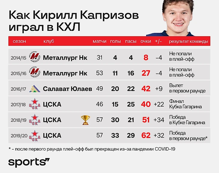 Контракт с ЦСКА он отработал полностью – уехал в НХЛ летом 2020 года. Возможно, выиграть второй кубок с армейцами Капризову помешала только остановка плей-офф из-за эпидемиологической ситуации.
