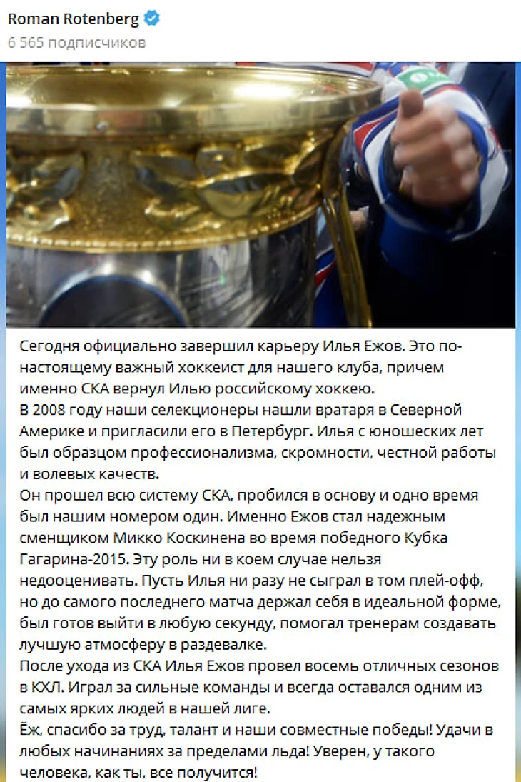 Роман Ротенберг поблагодарил Ежова за карьеру