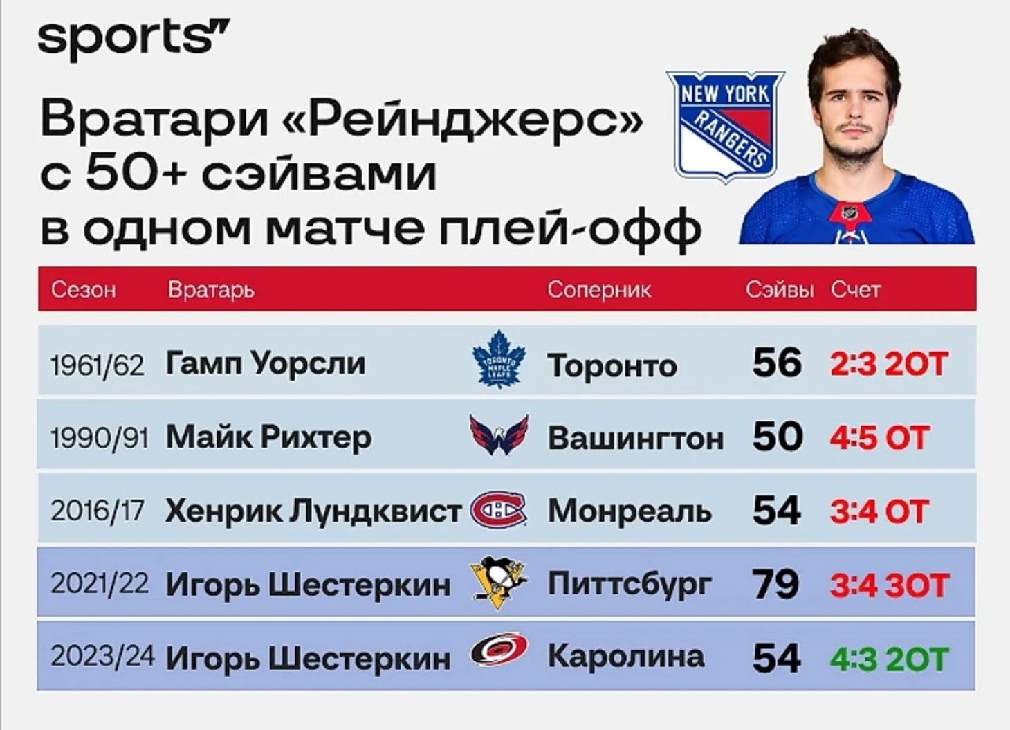 Винсент Трочек уверен в Игоре: «Он может украсть для нас любую игру если захочет, уверен это случится в важный момент сезона». «Рейнджерс» сейчас единственная команда которая сыграла более 165 игр в плей-офф в эру потолка зарплат и не выиграла Кубок (близко с ними «Сан-Хосе» - 157 матчей, но эти ребята пару лет точно будут без плей-офф). За это время лишь однажды дошли до финала с Хенриком Лундквистом в воротах, который был их лучшим игроком на тот момент. От Шестёркина возможно требуется и меньше, ведь атака сейчас более вариативная чем 10 лет назад, но ключевые спасения в важные моменты от него ждут. И он уже их делает, украду картинку из соседнего поста по сегодняшнему матчу. В конце 3го периода и в начале овертайма всё шло к тому, что «Каролина» сравняет счёт в серии и в Роли серия начнётся с начала, только бужет уже до 3х побед. Но важнейшие сейвы не позволили «Каролине» забрать игру, и теперь 2-0 в серии в пользу «Рейнджерс» выглядят отличным заделом для будущего финала конференции.
