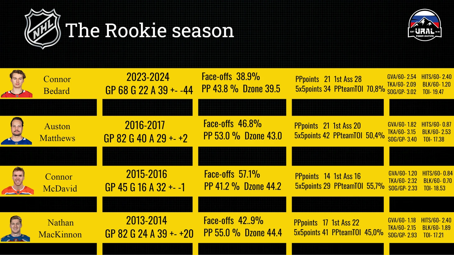 Будет ли Бедард NEXTGEN?  Для сравнения ,статистика нынешних суперзвезд в первый год в НХЛ. Что бросается в глаза,так это большое количество потерь и ужаснейший +-. Так же, он уже ключевой игрок большинства ( выходит на лёд в 70 % от общего времени команды ). Вероятнее всего, возьмет Колдера -приз лучшему новичку. Но мы ждём, более сильного прогресса от Коннора в следующем сезоне