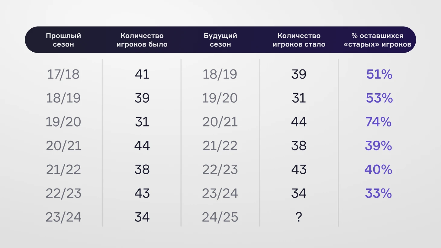 Процент сохранения игроков состава команды, сыгравших хотя бы один матч в сезоне, навевает еще больше тревоги.
