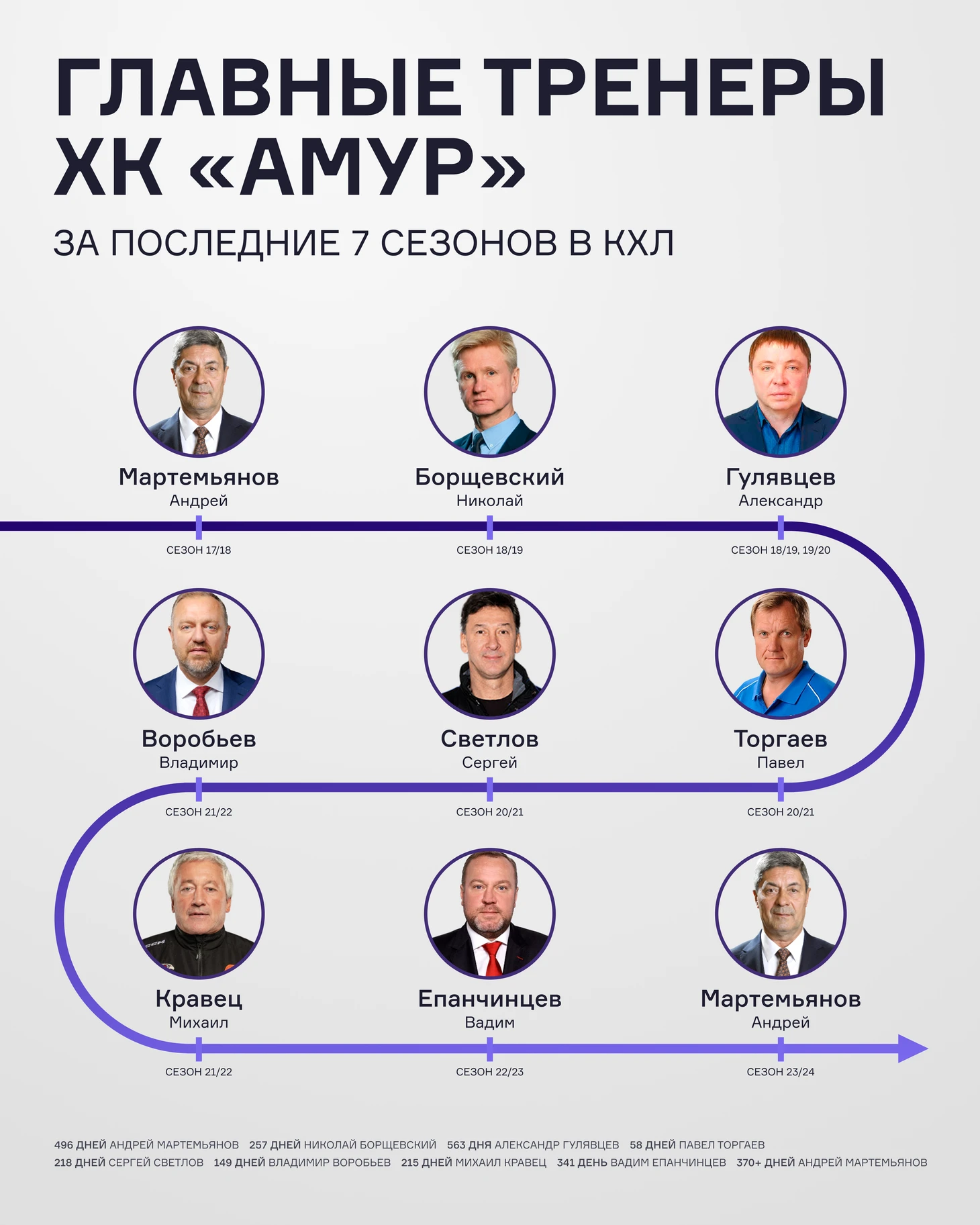 За 7 последних сезонов (назовем это «Междумартемьяновщина», или «от одного плей-офф до другого», как самые важные временные рамки клуба за последние годы) главный тренер в Хабаровске менялся 8 раз, 3 раза дважды за сезон.