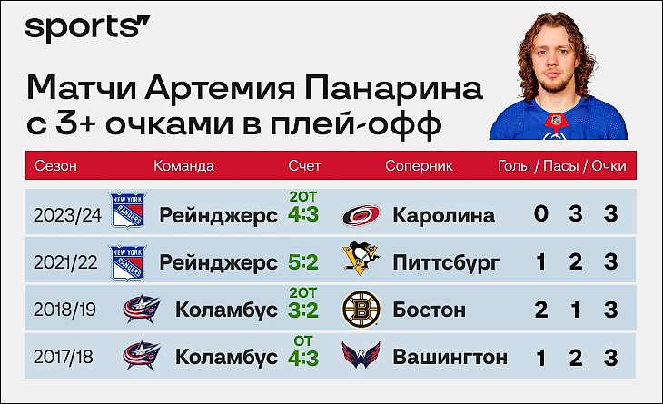 В текущем плей-офф у нападающего 7 (3+4) очков в шести матчах – по этому показателю он делит третье место в команде с Лафреньером. Лучше идут только Мика Зибанежад (11) и Винсент Трочек (10). В сумме за регулярку и плей-офф у Панарина набралось 127 (52+75) очков в 88 играх сезона-2023/24. Так он установил рекорд «Рейнджерс» и превзошел показатель Яромира Ягра (124, сезон-2005/06).