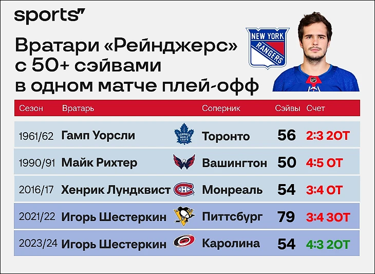 Шестеркин – это еще и четвертый вратарь в истории «Рейнджерс», сделавший 50+ сэйвов в одном матчей плей-офф. Такого показателя он достиг не впервые. В 2022 году Игорь отразил 79 бросков (рекорд клуба) в матче первого раунда против «Питтсбурга». По итогам игры с «Каролиной» он стал первым, кому покорилось такое достижение в победном матче.