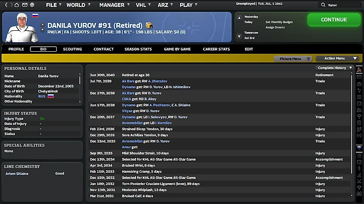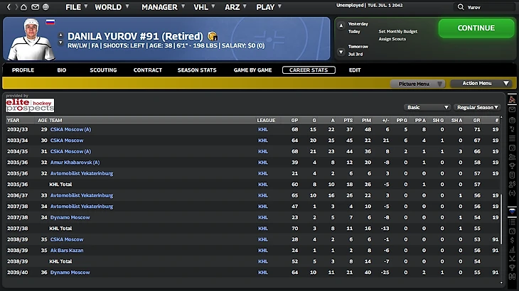 В сезоне 2039/2040 Юров завершил свою профессиональную карьеру в составе московского «Динамо», куда он вернулся второй раз. В реальности его ожидания были связаны с выступлением в ТОП-6 НХЛ или даже выше, но в симуляции они не оправдались. Он стал крепким игроком КХЛ, но не достиг более высоких результатов.