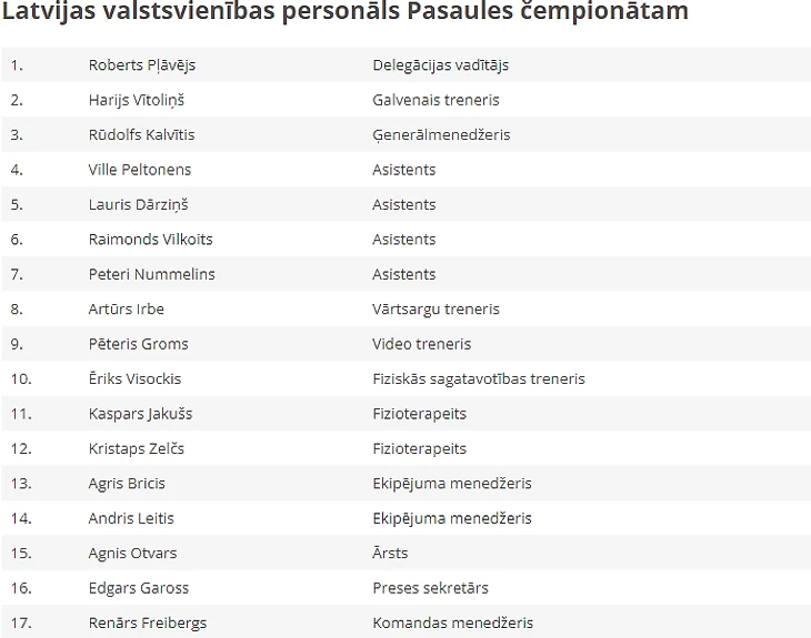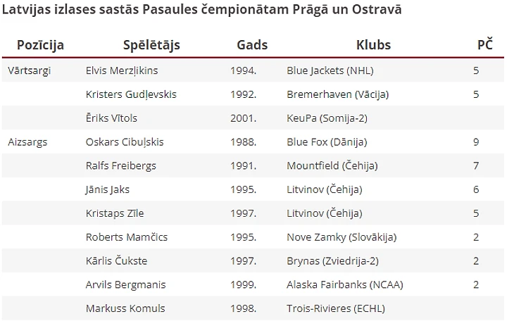 В этом составе самый большой опыт у Даугавиньша, для которого это будет уже 12-й чемпионат. Микс Индрашис и Роберт Букартс сыграют на ЧМ в 11-й раз, Оскар Цибульскис - в десятый.