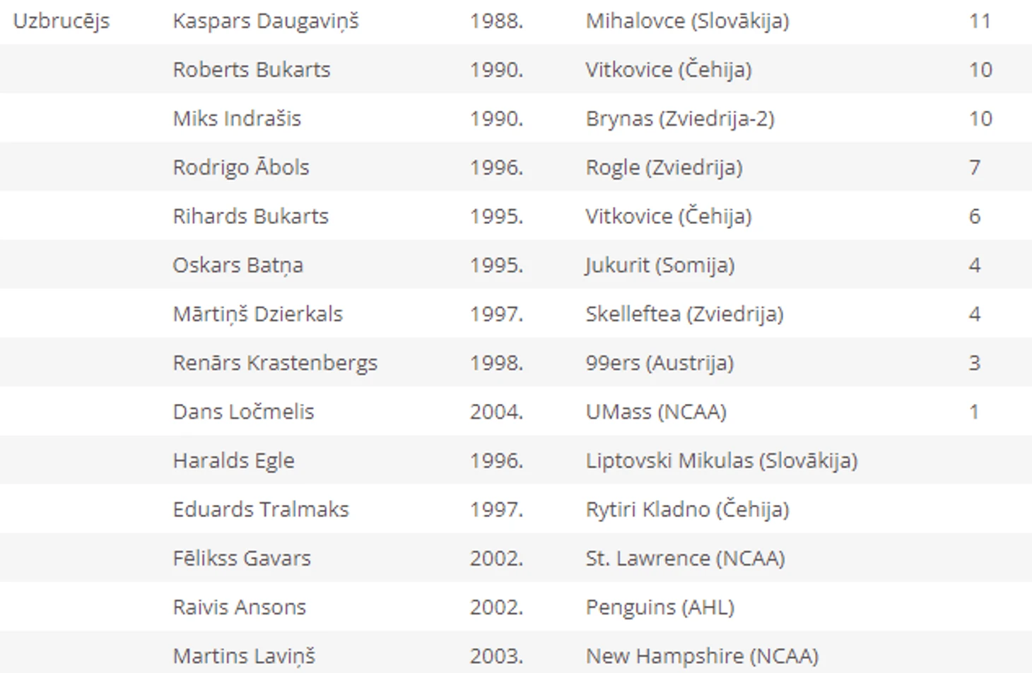 В свою очередь, в клубах НХЛ сезон продолжают вратарь Артур Шилов, нападающий Теодор Блюгер и защитник Увис Балинскис, а нападающий Земгус Гиргенсонс находится в поисках нового места работы, поэтому этой весной к сборной не присоединится.