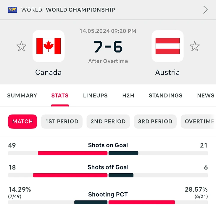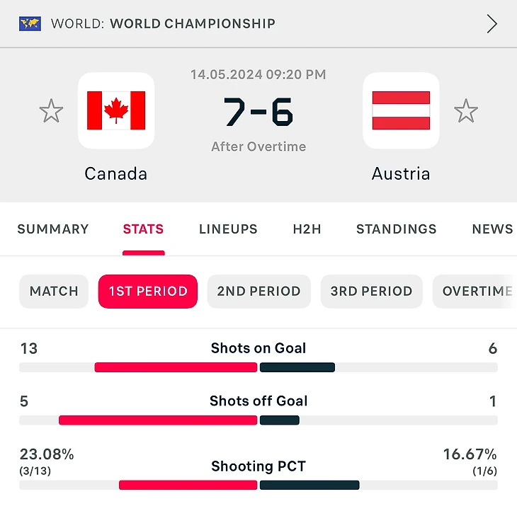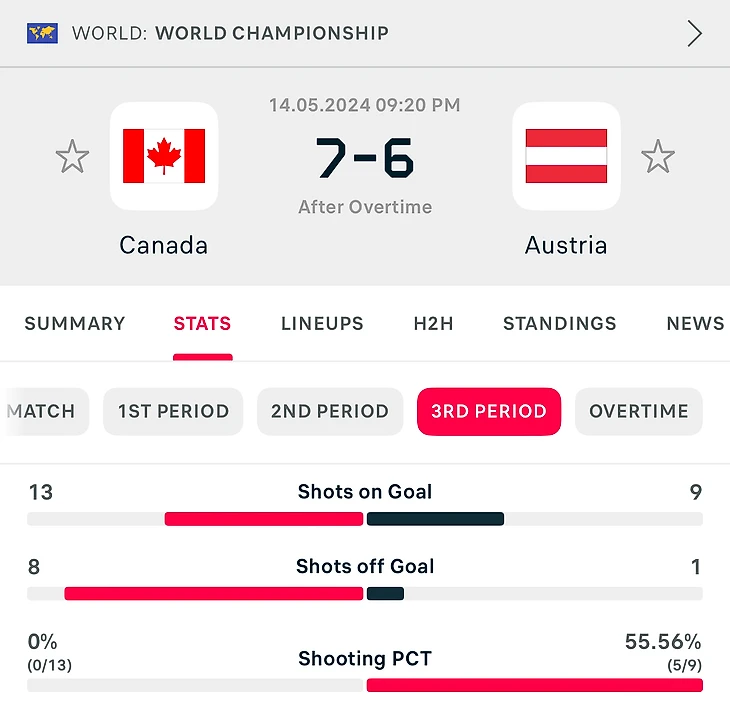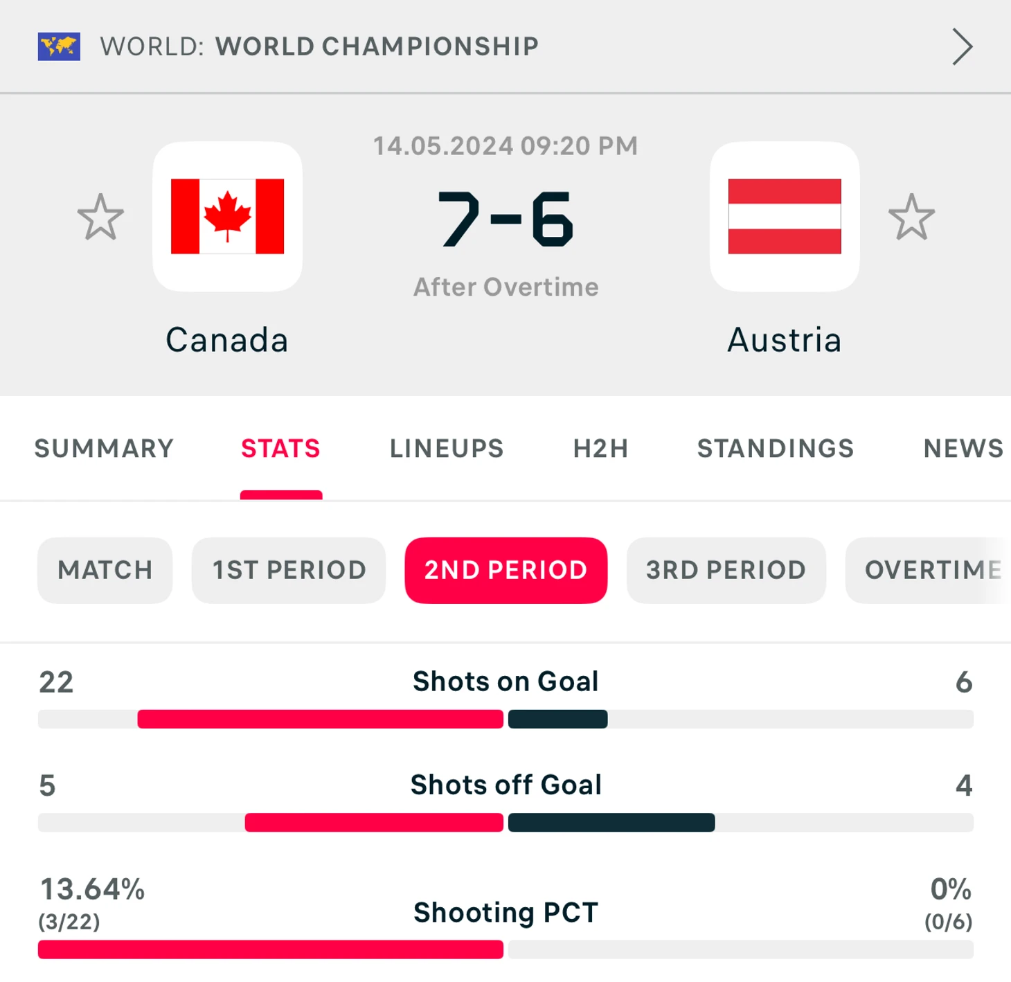 Сегодняшний матч между сборными командами Канады и Австрии ввел всех (меня точно) в экстаз. Команды набросали на двоих 13 шайб! Внимание, не Канада набросала Австрии тринадцать шайб, как многие могли подумать, а команды на двоих набросали 13 шайб. Европейская команда совершила подвиг, отыгравшись со счета 1:6 за ОДИН период. Австрийцы забросили пять безответных шайб за двадцать минут! И нет, это не видеоигра или онлайн-симуляция, это матч Чемпионата мира по хоккею 2024.
