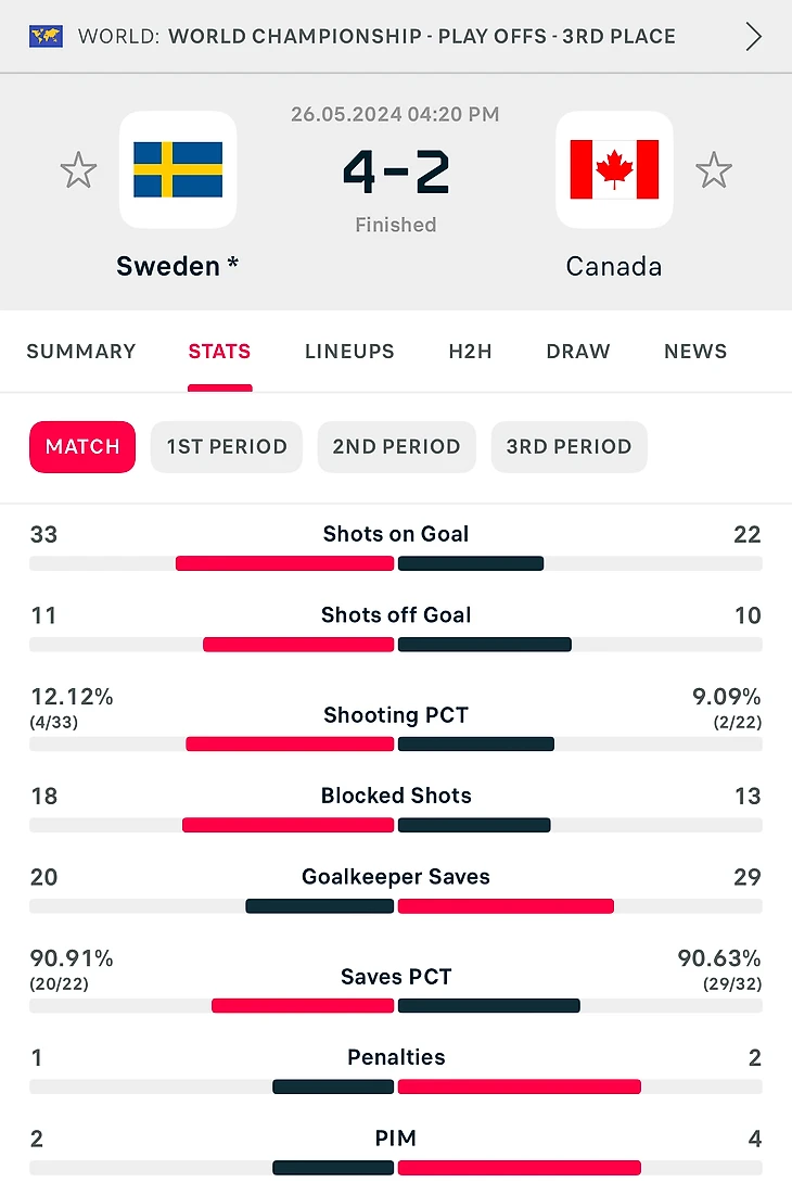 Швеция обыграла Канаду на Чемпионате мира-2024 в борьбе за бронзу