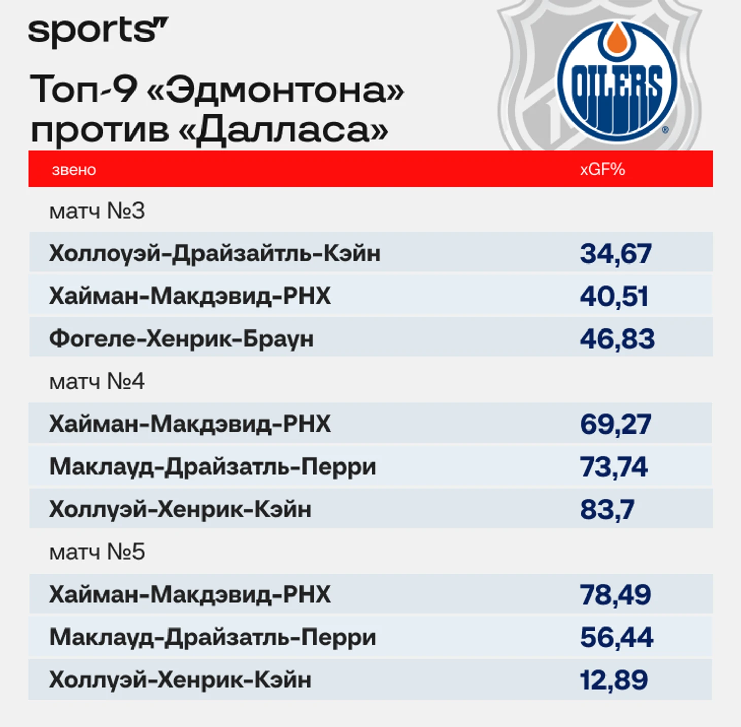 Процент созданных ожидаемых голов у каждой тройки «Эдмонтона» отражает этот прогресс лучше всего.
