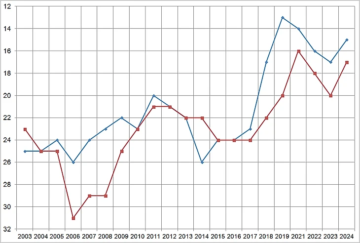 Теперь «квантовый скачок» виден достаточно хорошо. Позиции на ЧМ делятся на две не пересекающиеся зоны: 2003-2017, где лучший результат – 21 место, и 2018-2024, где худший результат – 17 место. Аналогичная картина и с рейтингом ИИХФ, только смещённая на год и менее яркая: в 2003-2018 лучшая позиция в рейтинге – 21, в 2019–2024 – худшим было 20 место.