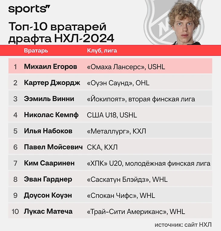 Сайт НХЛ представил топ-10 лучших вратарей драфта 2024 года. На первом месте неожиданно оказался российский голкипер Михаил Егоров, выступающий в USHL за «Омаху Лансерс».