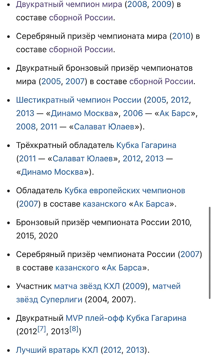 Наград очень много. Думаю Еременко можно с уверенностью назвать главным вратарем КХЛ в истории. В нашей родной лиге Александр провел 14 лет, за эти годы он сумел провести 405 матчей, в которых средний процент отраженных бросков составлял практически 93%. Когда Еременко был на пике, такого тренда на российских вратарей в НХЛ не было, может поэтому Александр и не решился, но тем не менее карьера получилась великолепная.