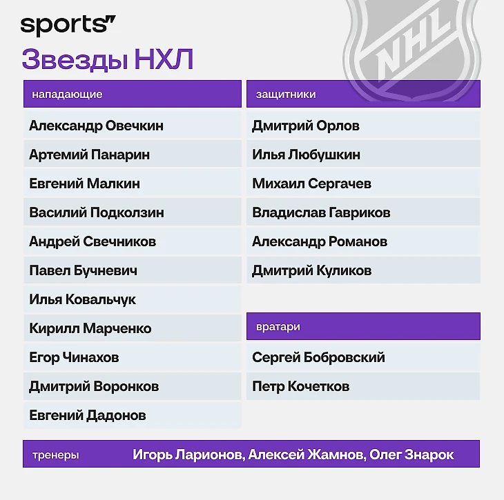 Ищем знакомые фамилии в предварительных составах. Важно: до матча возможны изменения – раскладка предварительная. Российские игроки из НХЛ сыграют с россиянами из КХЛ.