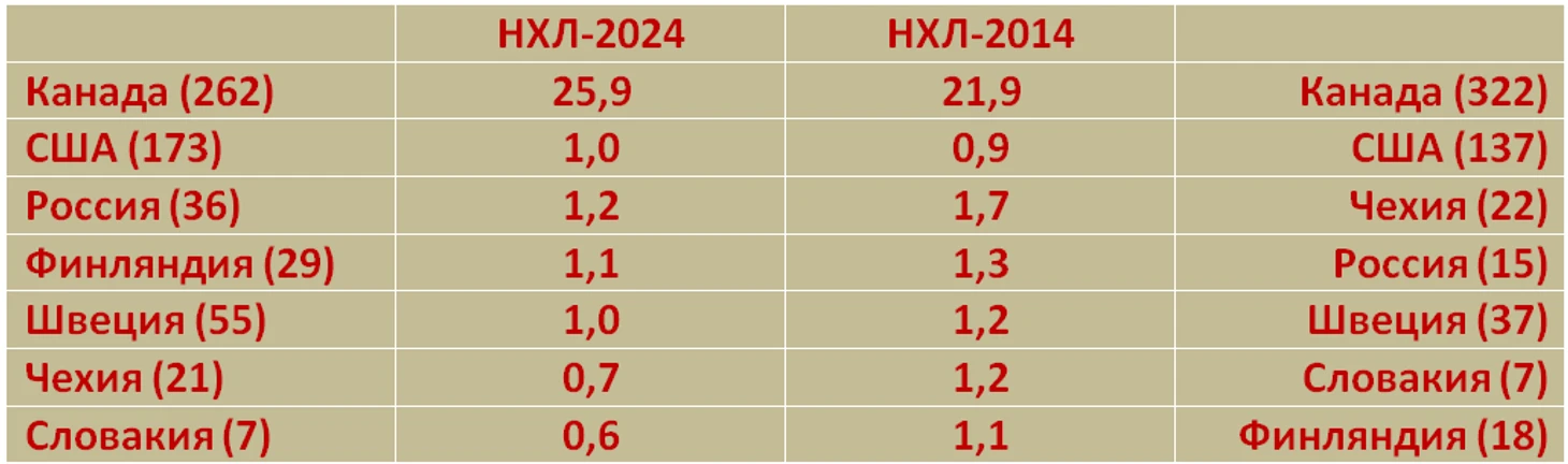 Видно, что уже в 2014 г. превосходство европейцев над канадцами по средней результативности уменьшилось, по сравнению с 1998 г. А в 2024 г. это превосходство фактически пропало (обратите внимание на отрицательные показатели чехов и словаков).