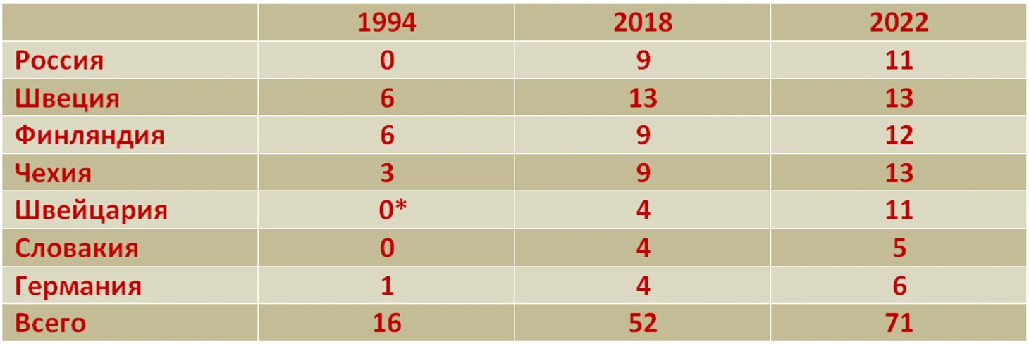 В приведённой ниже табличек для семи главных европейских контендеров указано число игроков, которые до начала ОИ успели сыграть как минимум один матч в НХЛ, а потом провели в Европе как минимум один полый сезон, до начала ОИ или собственно олимпийский. Для сравнения приведены аналогичные данные для ОИ1994, а у Швейцарии, которая не пробилась в Лиллехаммер – для ОИ1992.