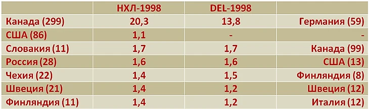 Вот, для примера, результаты подсчёта для двух лиг – НХЛ и DEL в сезоне 97/98. Сравнение любопытное, поскольку в ту пору НХЛ уже в полной мере наслаждалась последствиями падения «железного занавеса», а DEL перешла на полноценный безлимит: никаких ограничений на приглашение иностранцев в немецкие хоккейные клубы. Для хозяев показана средняя результативность игрока (в НХЛ за «хозяев» условно приняты канадцы), для других стран – отношение средней результативности к результативности «хозяев». В скобочках – общее число учтённых игроков.