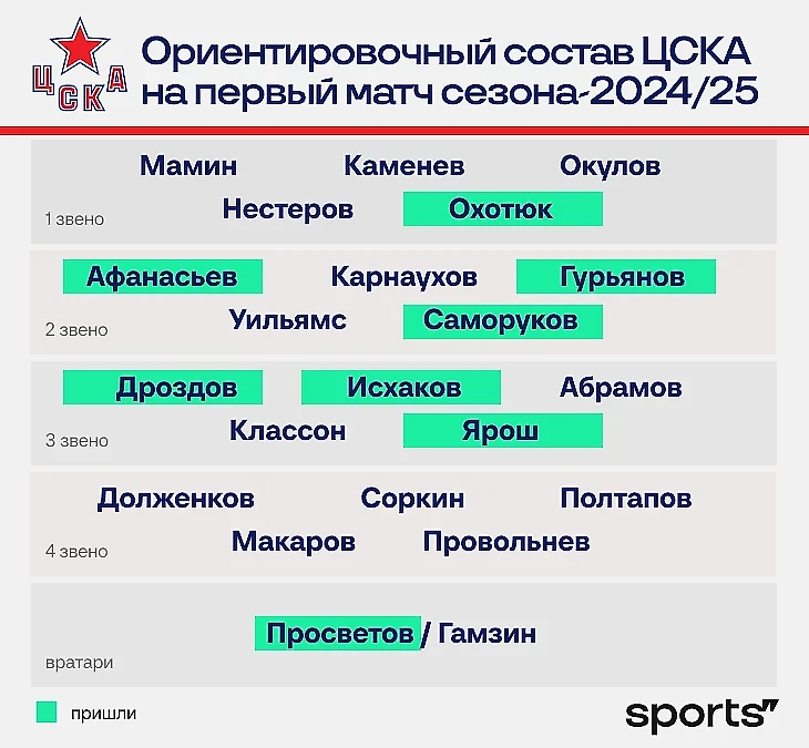 Данное событие дало зелёный свет всем Североамериканским новичкам «ЦСКА», о подписании которых журналисты сообщали ещё в начале Июля. Вчера же пресс-служба армейцев официально объявила о переходе в их клуб Ивана Просветова, Дениса Гурьянова, Никиты Охотюка, Дмитрия Саморукова, Егора Афанасьева и Руслана Исхакова. Иван Дроздов, перешедший в стан армейцев еще в начале Июня из Салавата Юлаева, подписал контракт на 3 года. Полный список изменений в составе «ЦСКА» – https://www.khl.ru/news/2024/07/21/531024.html#to2. В каких же сочетаниях выйдут на лёд армейцы?