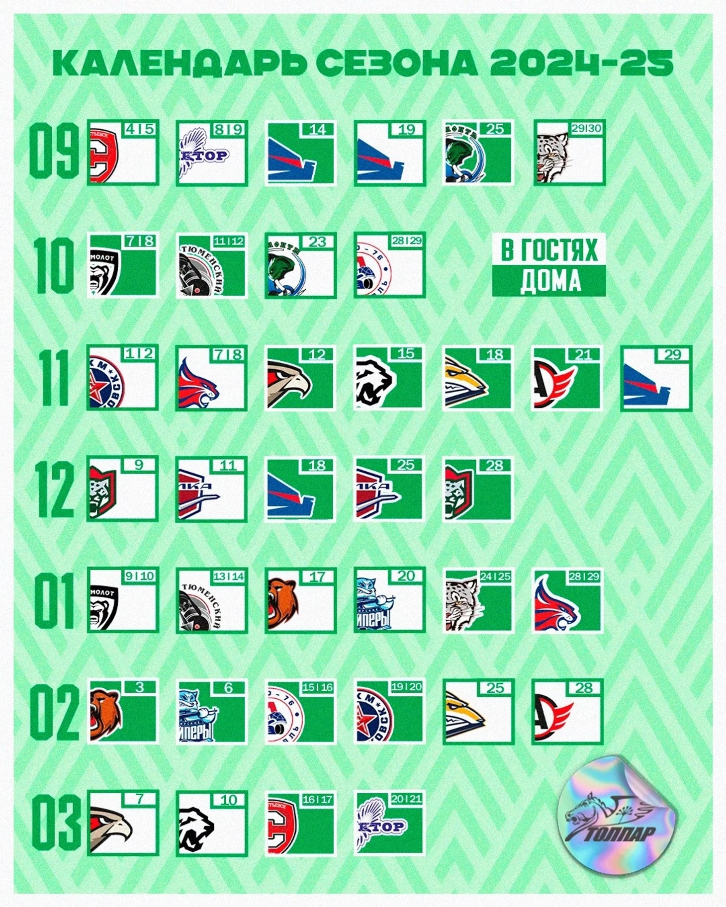 Сезон для «Толпара» начнётся играми в Татарстане: 4 и 5 сентября наша «молодёжка» сыграет со «Спутником» из Альметьевска, а 8 и 9 сентября проведут спаренные матчи с «Реактором» в Нижнекамске. С этими же командами уфимцы завершат регулярный чемпионат на домашнем льду во второй половине марта.