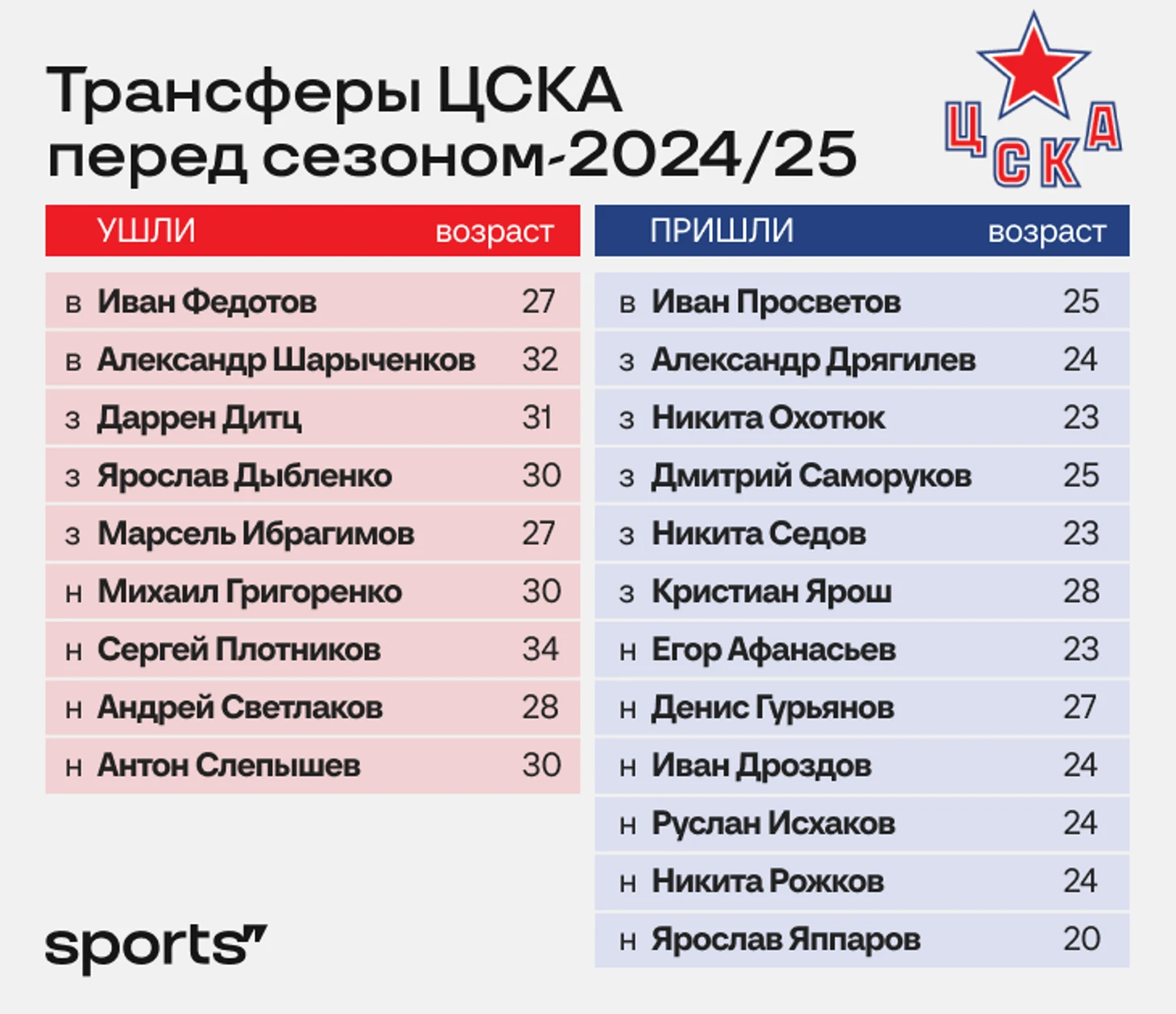 ЦСКА подписал почти всех новичков лишь в первый день сборов. Повлияла новость, что КХЛ стала независимой от ФХР. Для оформления переходов больше не требуется трансферная карта. Подробно мы разбирали эту историю в отдельном материале.