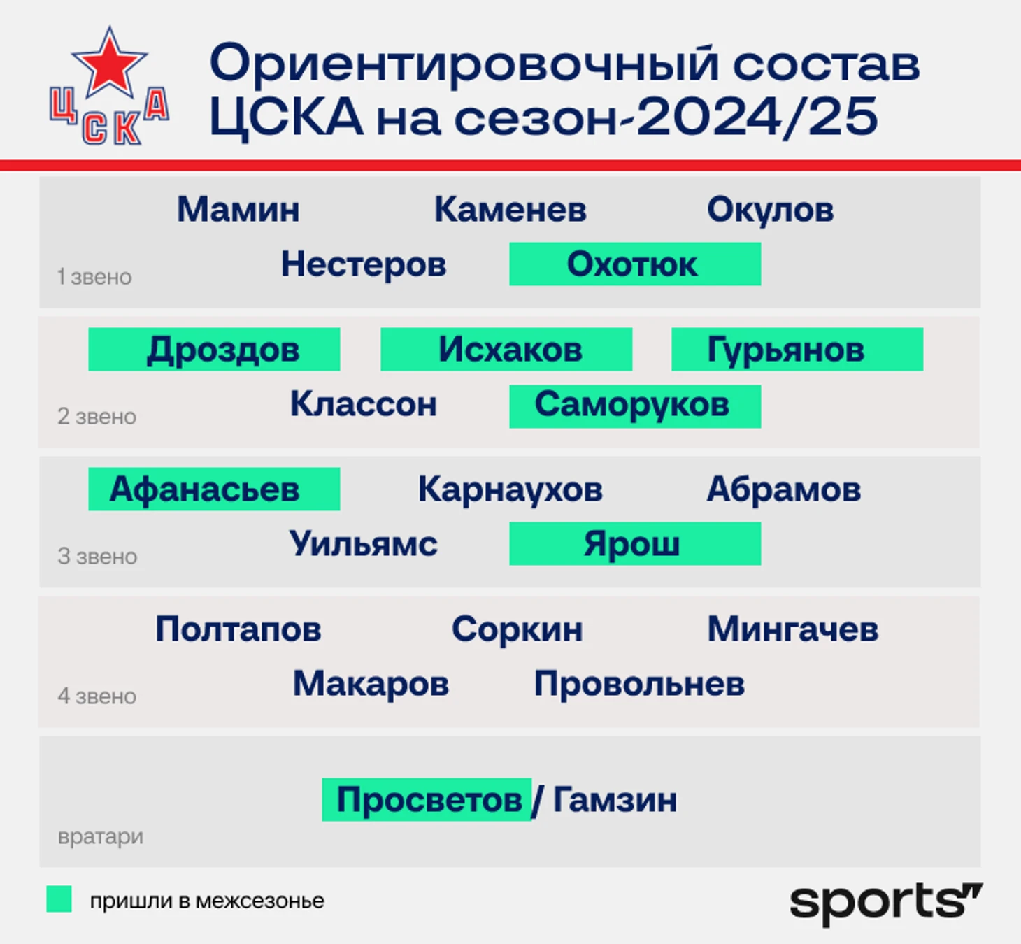 Везде (в том числе и у нас в предыдущих постах) мелькали разные варианты по звеньям. Каждый из них имеет право на существование, но при более глубоком анализе ситуации вырисовывается еще один. Нам кажется, что он и будет основным к старту сезона. Окончательный состав ЦСКА сформирует по итогам сборов.