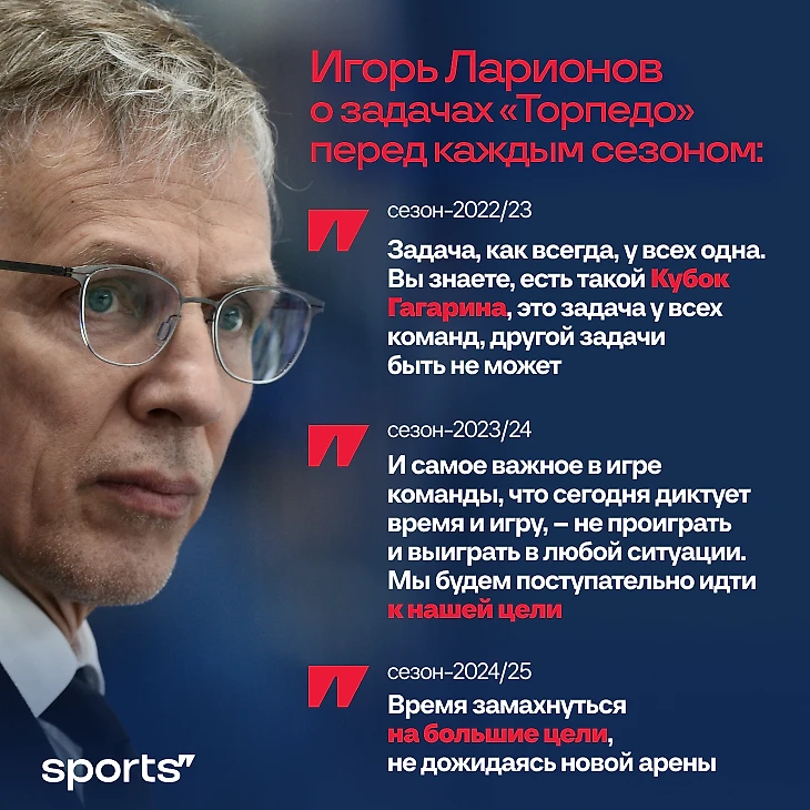 Такой спад самого Ларионова не смущает. Он ставит перед «Торпедо» серьезные цели на ближайший сезон: «В Нижнем Новгороде хоккей – спорт номер один, но за 78 лет у «Торпедо» ни одного топового титула. Время замахнуться на большие цели, не дожидаясь новой арены».