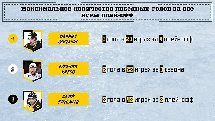 В плей-офф мы и играли мало и побеждали тоже. Но все-таки лидеры в победных голах в плей-офф есть – Вовченко единолично расположился на 1 месте.