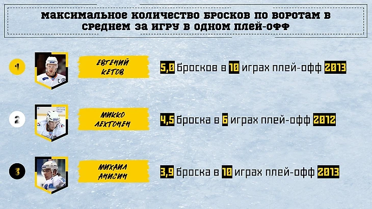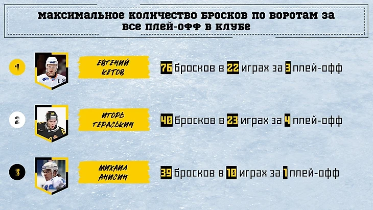 Сумма бросков в плей-офф. Кетов и здесь с огромным отрывом впереди. Гераськин на 1 бросок обогнал Анисина, проведя на 13 игр больше.