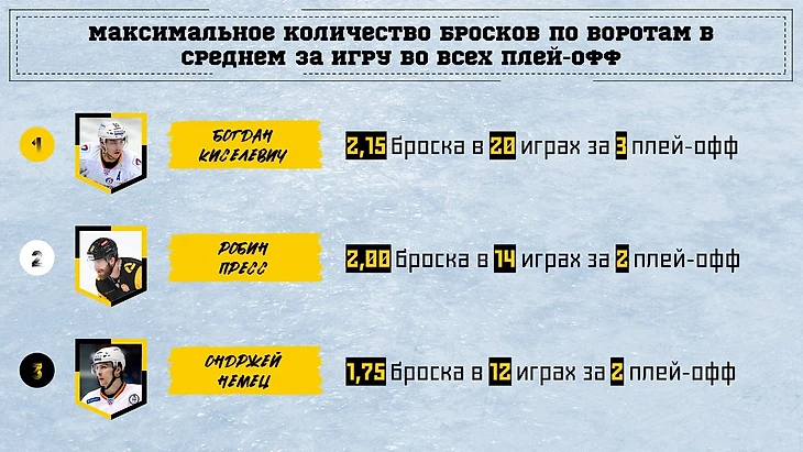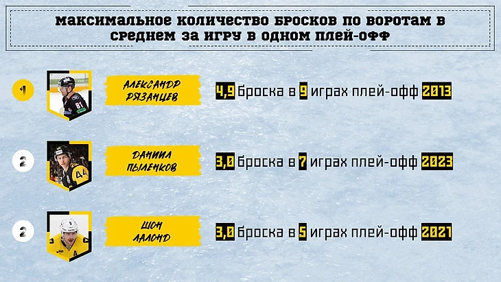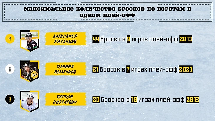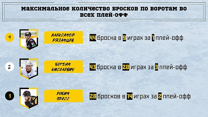 Сумма бросков за все плей-офф. Думали больше не увидите Рязанцева? А вот и нет – он за 1 плей-офф настрелял по воротам больше, чем любой другой за несколько. Киселевичу понадобилось сыграть на 11 игр больше, чтобы хотя бы подобраться к нему.