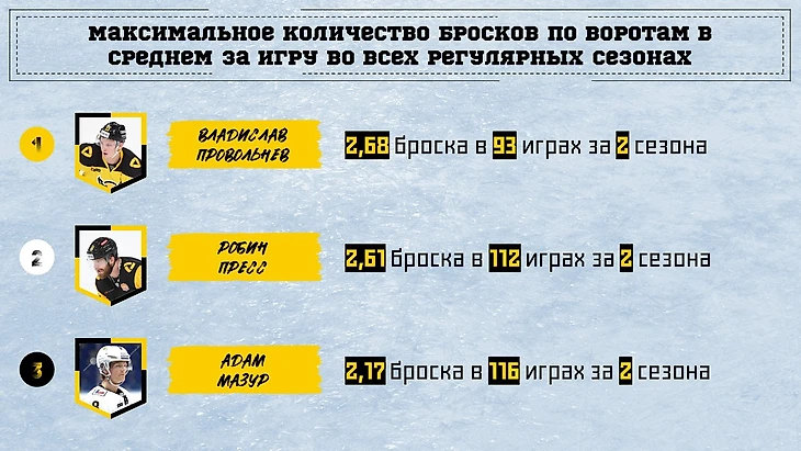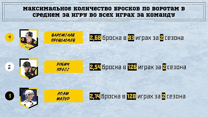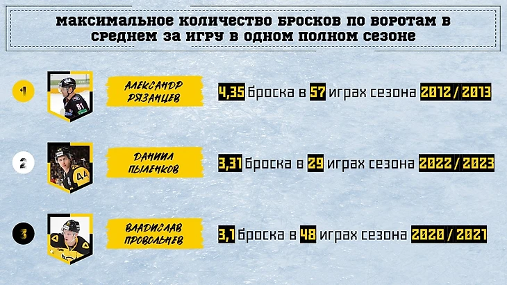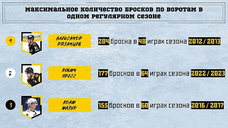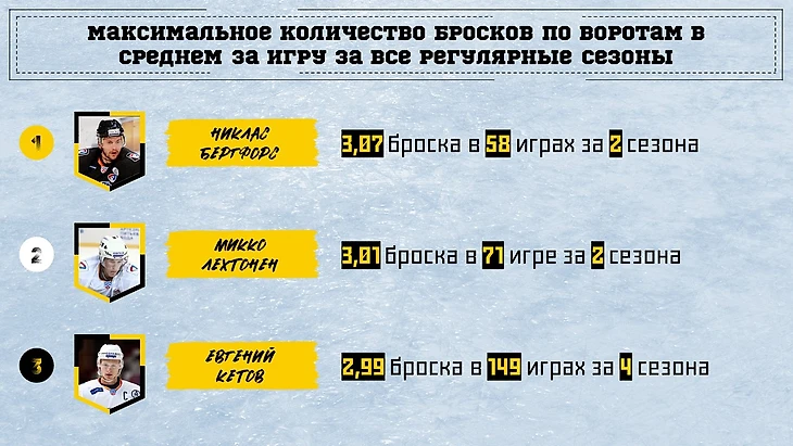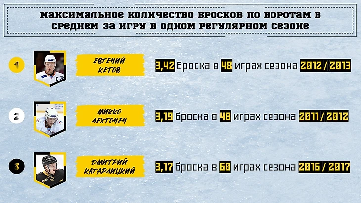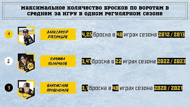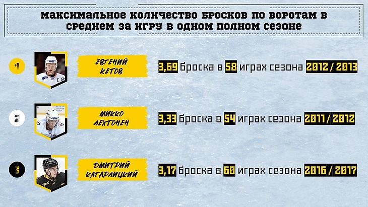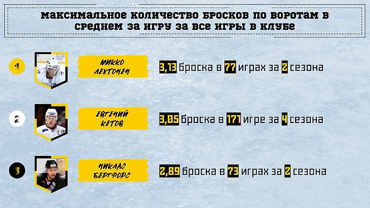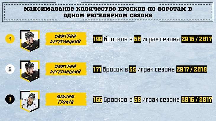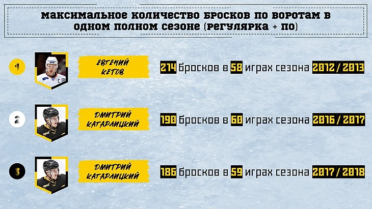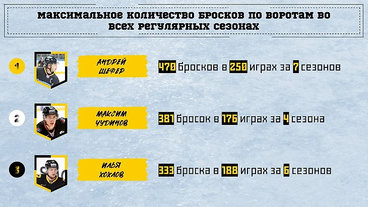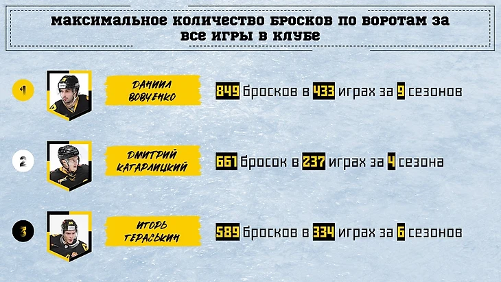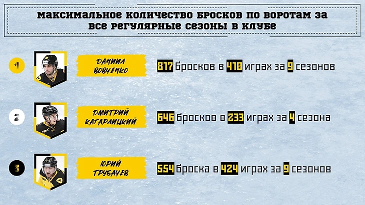 По сумме бросков за всю историю в лидерах – Вовченко. Из-за того, что учитываются только игры КХЛ, в этом показателе у Трубачева нет гигантского преимущества по количеству игр.