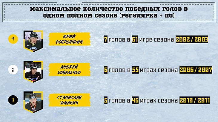 По количеству победных за один полный сезон на первом месте оказался Юрий Добрышкин с 7 голами, далее Коваленко и Жмакин. Доля победных голов от общего количества у нападающих ниже, чем у защитников (забивают гораздо чаще), например, у Добрышкина – 29%.