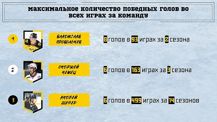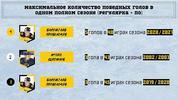 Первая номинация – количество победных за один сезон (с учетом плей-офф). Явный лидер – Влад Провольнев. Он забил 5 победных в сезоне-20/21 и с приличным отрывом опережает 2 и 3 места (на третьем тоже он). Вообще и у него и у Игоря Щадилова в отдельных шикарные показатели по доле победных голов от общего количества забитых: Провольнев 50% и 60%, Щадилов – 75% (забил 4 гола из них 3 были победными).